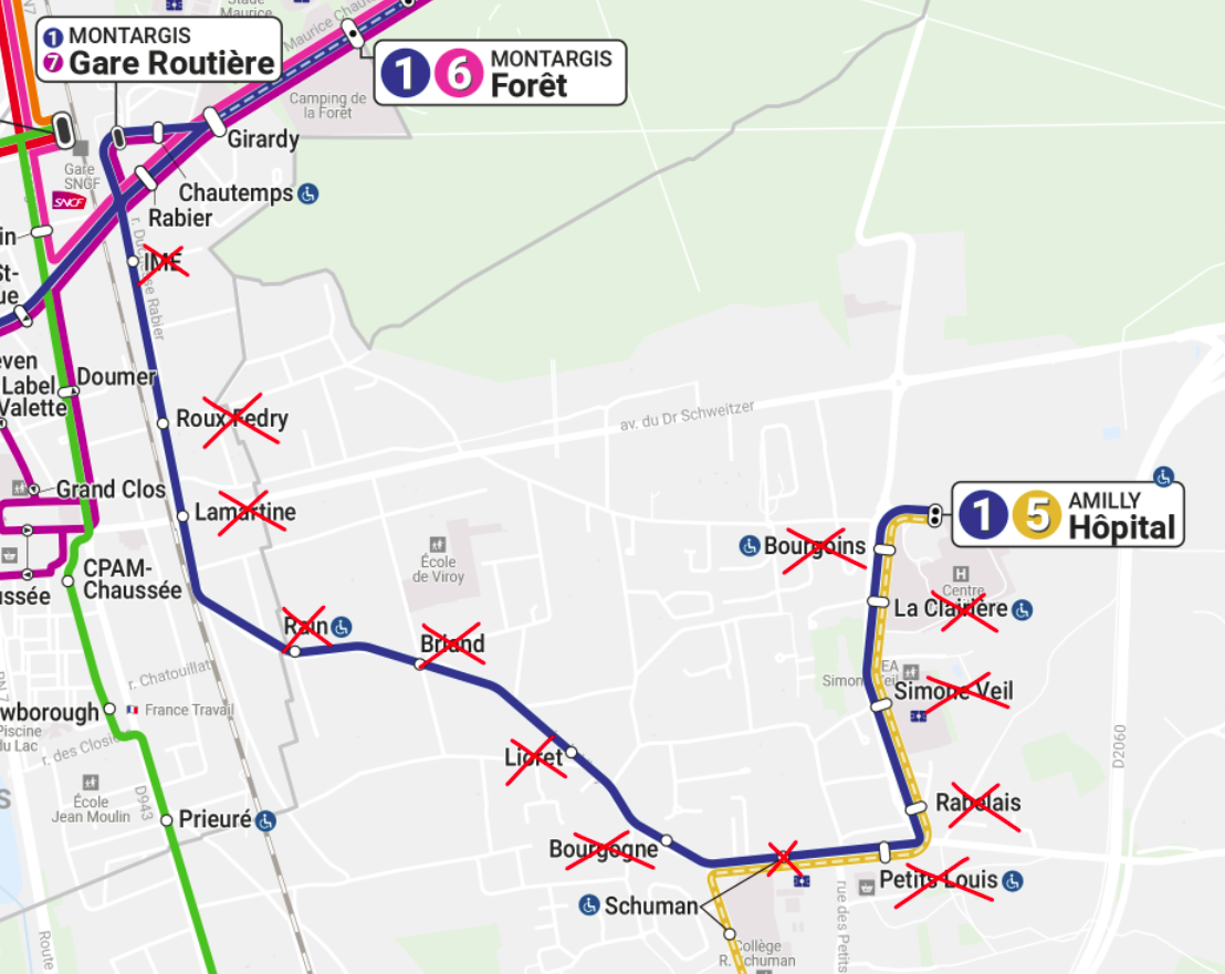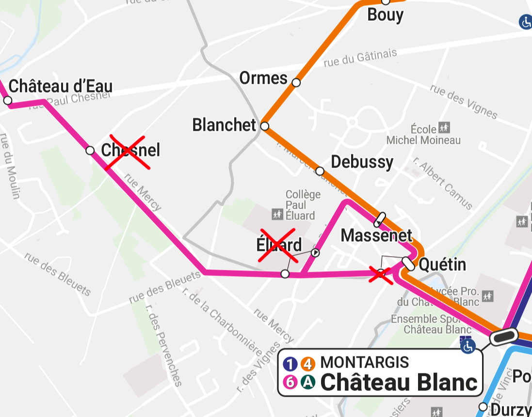 Le jeudi 23 et le vendredi 24 avril, en raison de travaux rue Duchesne Rabier à Montargis, les arrêts IME, Roux Fedry, Lamartine, Rain, Briand, Lioret, Bourgogne, Schuman, Petits Louis, Rabelais, Simone Veil, La Clairière et Bourgoins ne seront pas desservis.